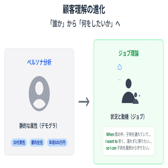 従来の「30代、男性、都内在住、年収〇〇万円…」といったペルソナ分析は、顧客を「点」で捉えるアプローチです。しかし、JTBDは「どんな状況(When)で、どんな動機(I want to)があって、どんな結果(so I can)を期待しているのか」という、顧客の「物語」で捉えようとします。