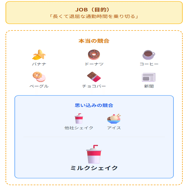 もし私たちが「ミルクシェイクを買う人」という属性だけで顧客を見ていたら、この「通勤時間の相棒」というジョブには、永遠にたどり着けなかったでしょう。